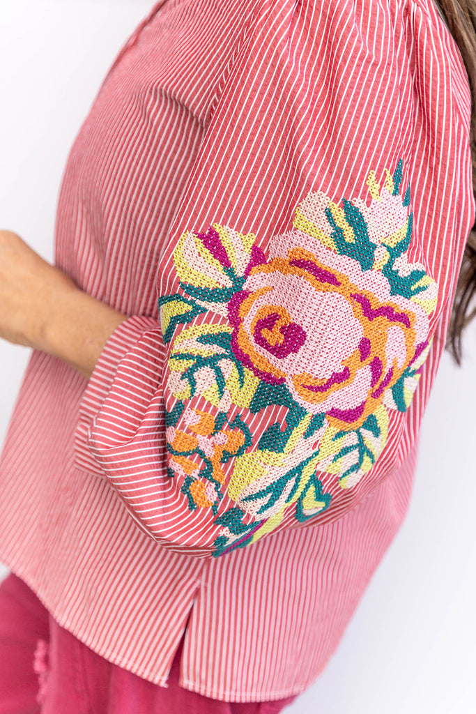 Stripe Delight Floral Blouse - Red