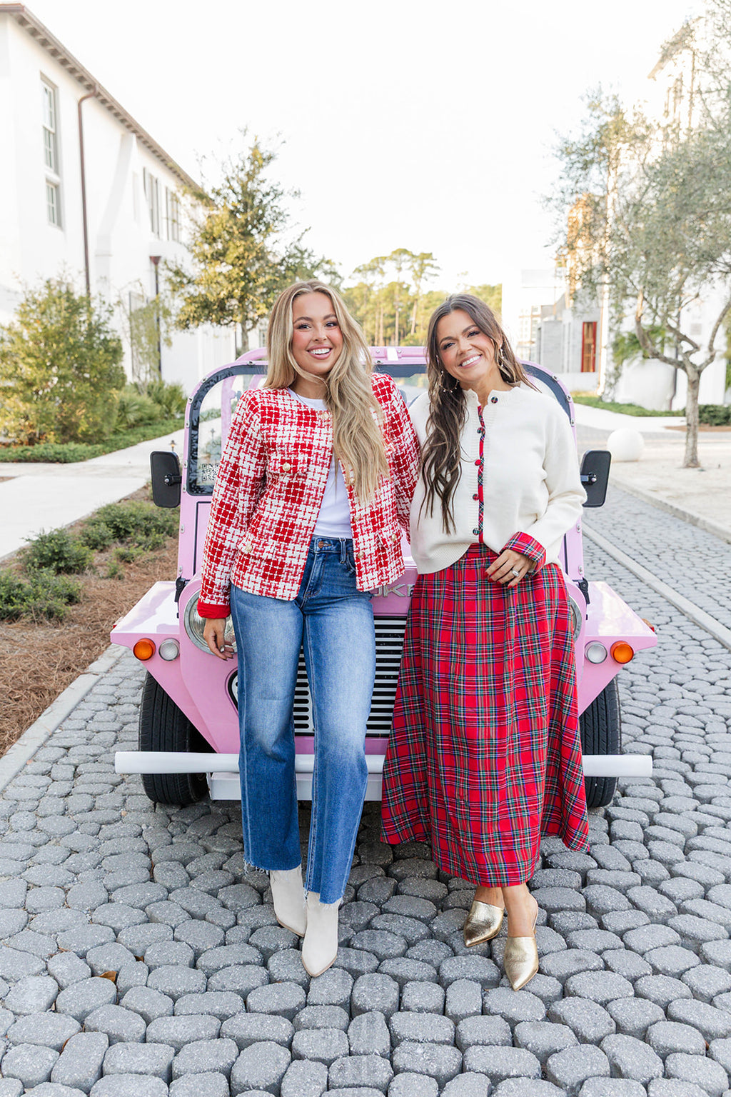 - Red and white tweed button down jacket.