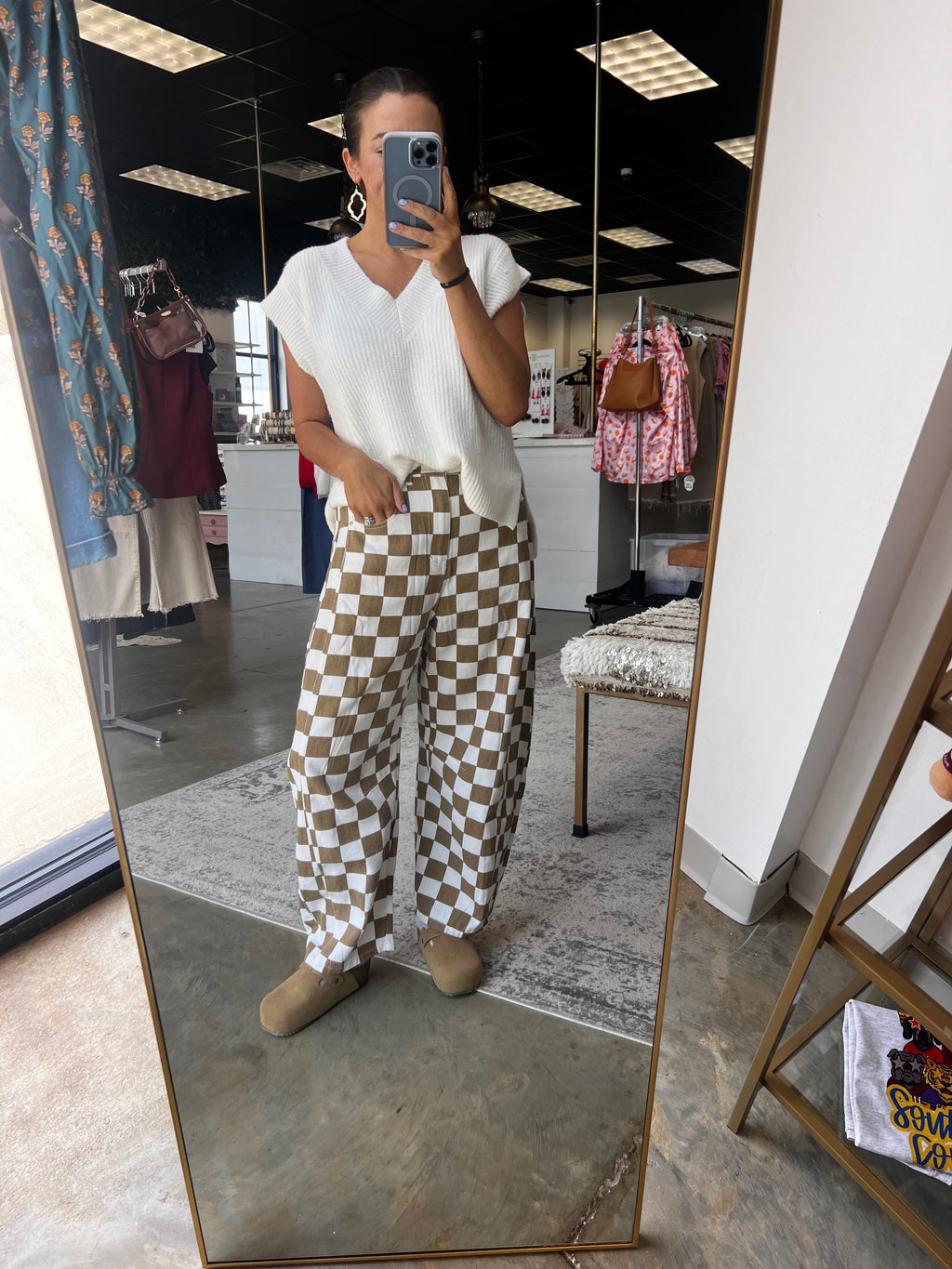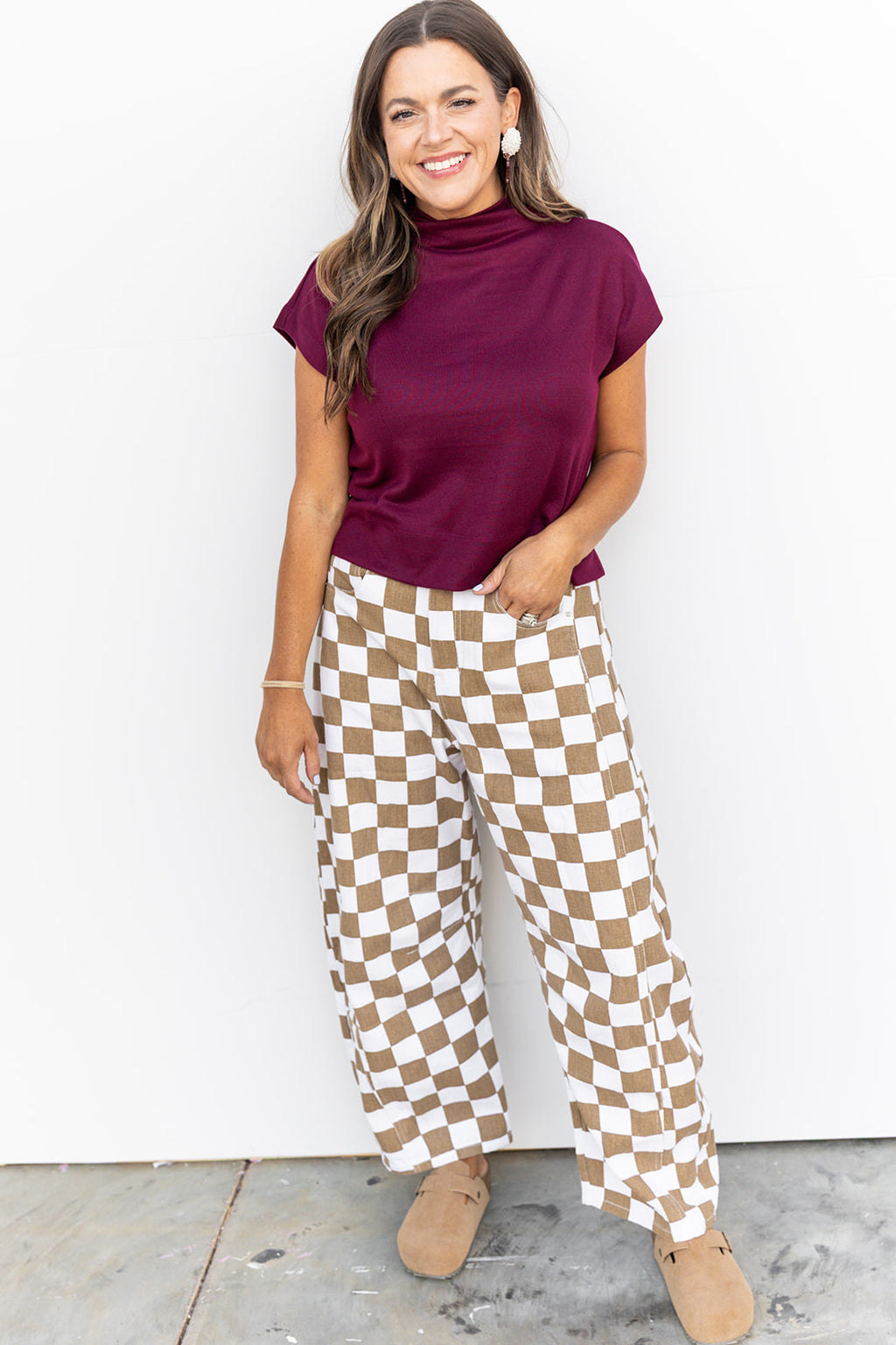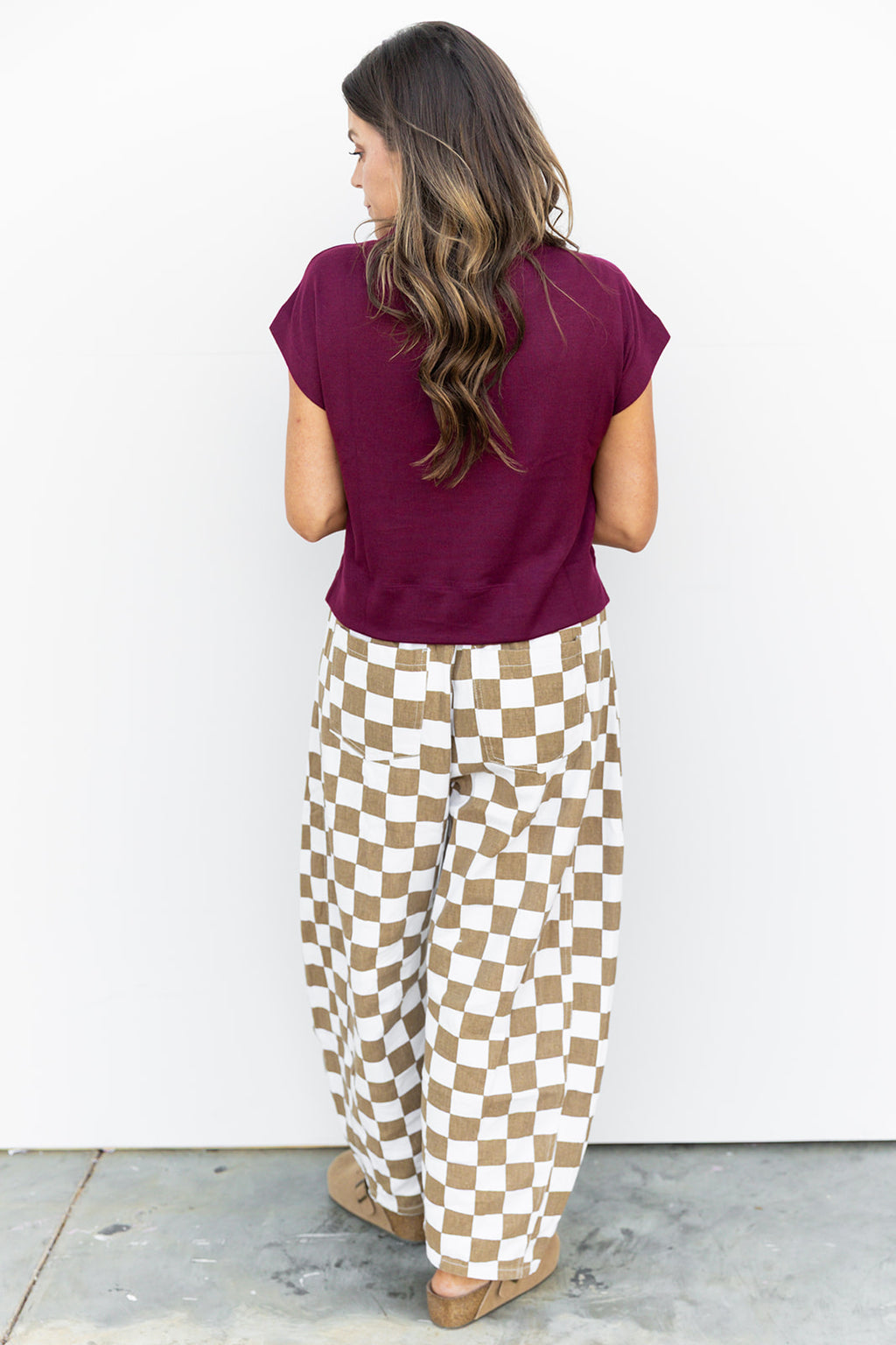 - Brown Check barrel jeans