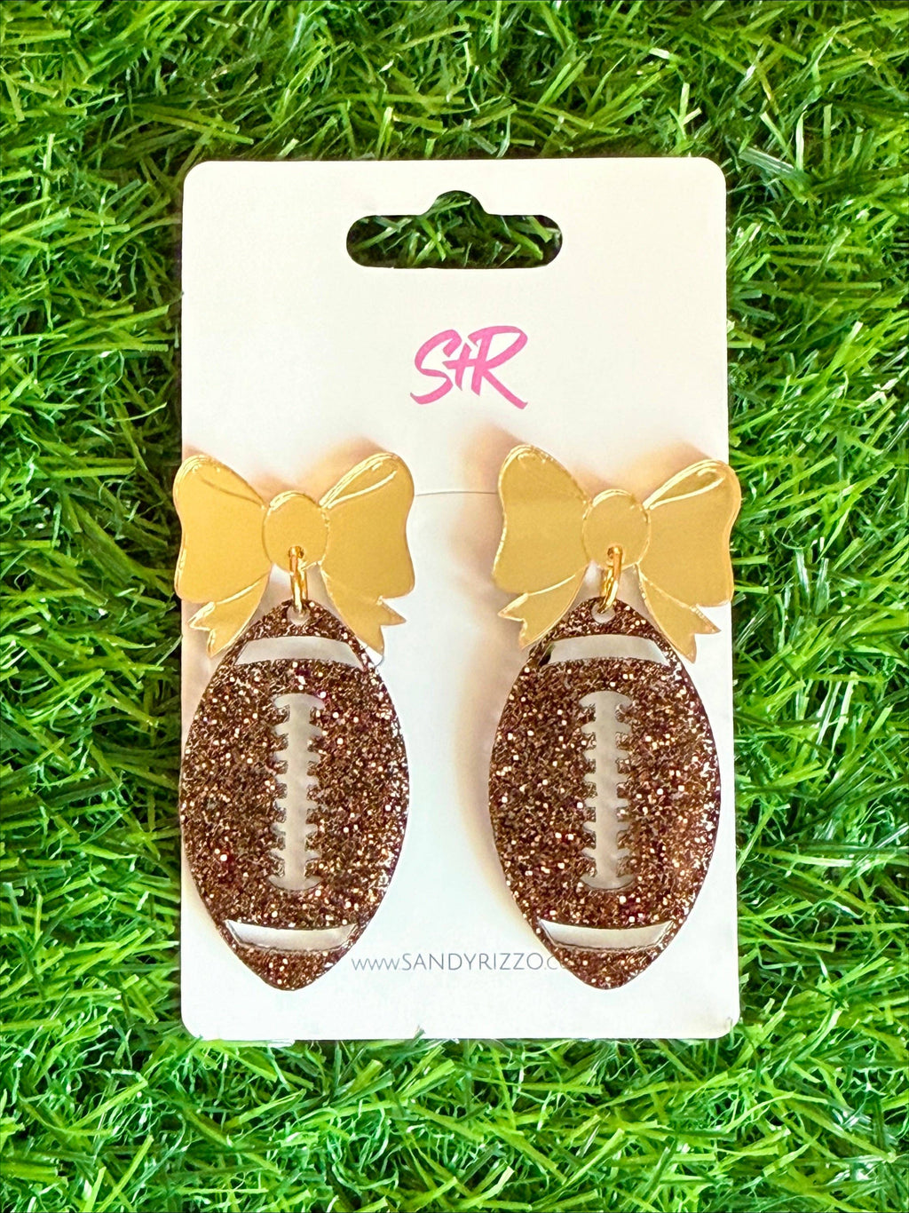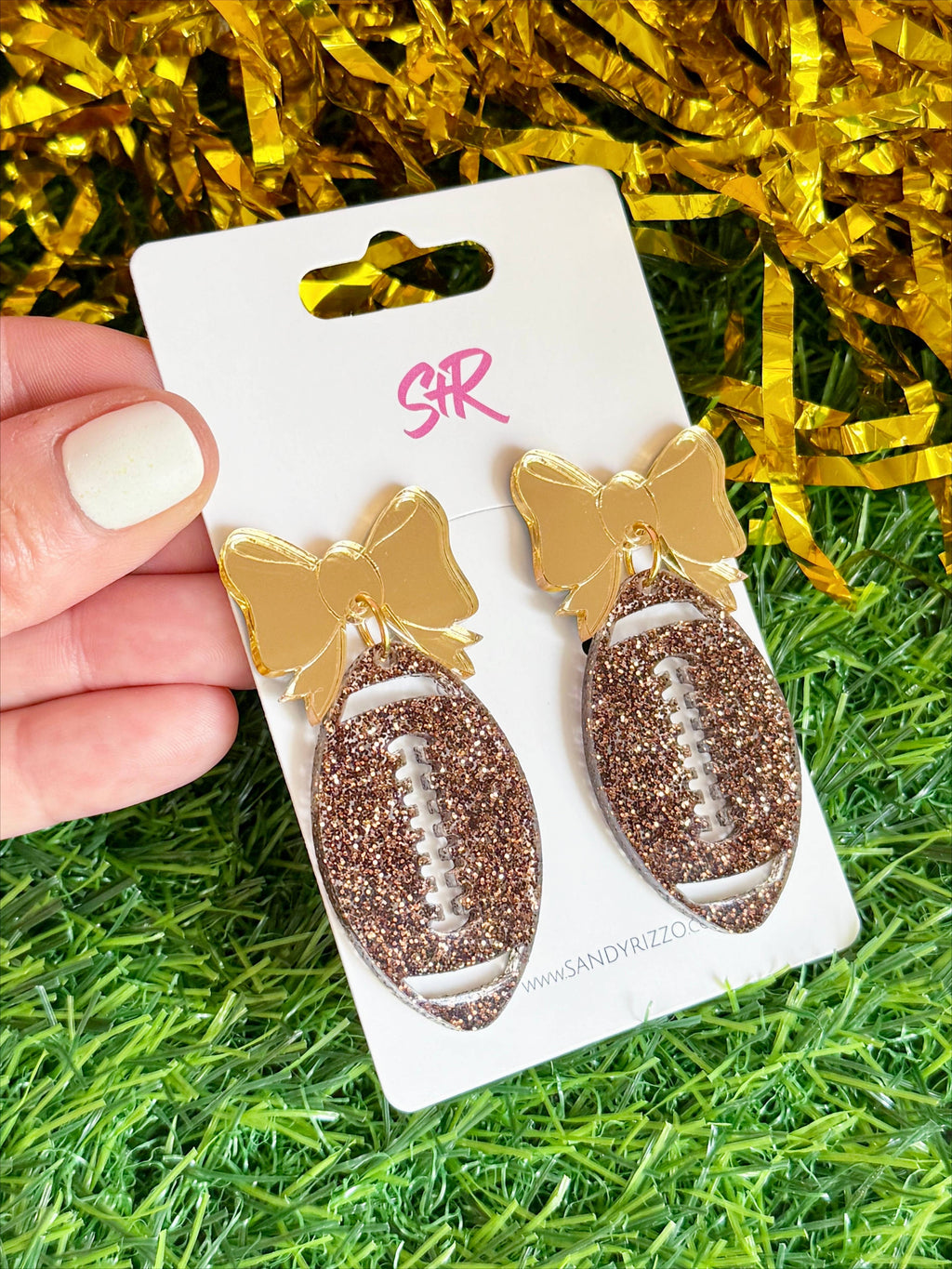 Here's the football for every girl! Glittery brown football dangle with a gold mirror bow top. The cutest way to cheer for your favorite football team!