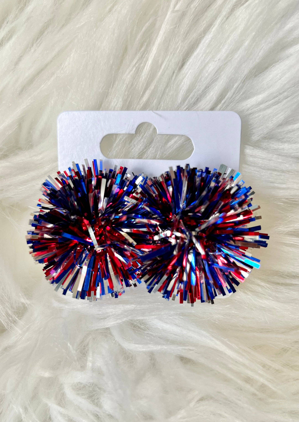 Red, Silver, and Blue Tinsel Party Pom Stud
