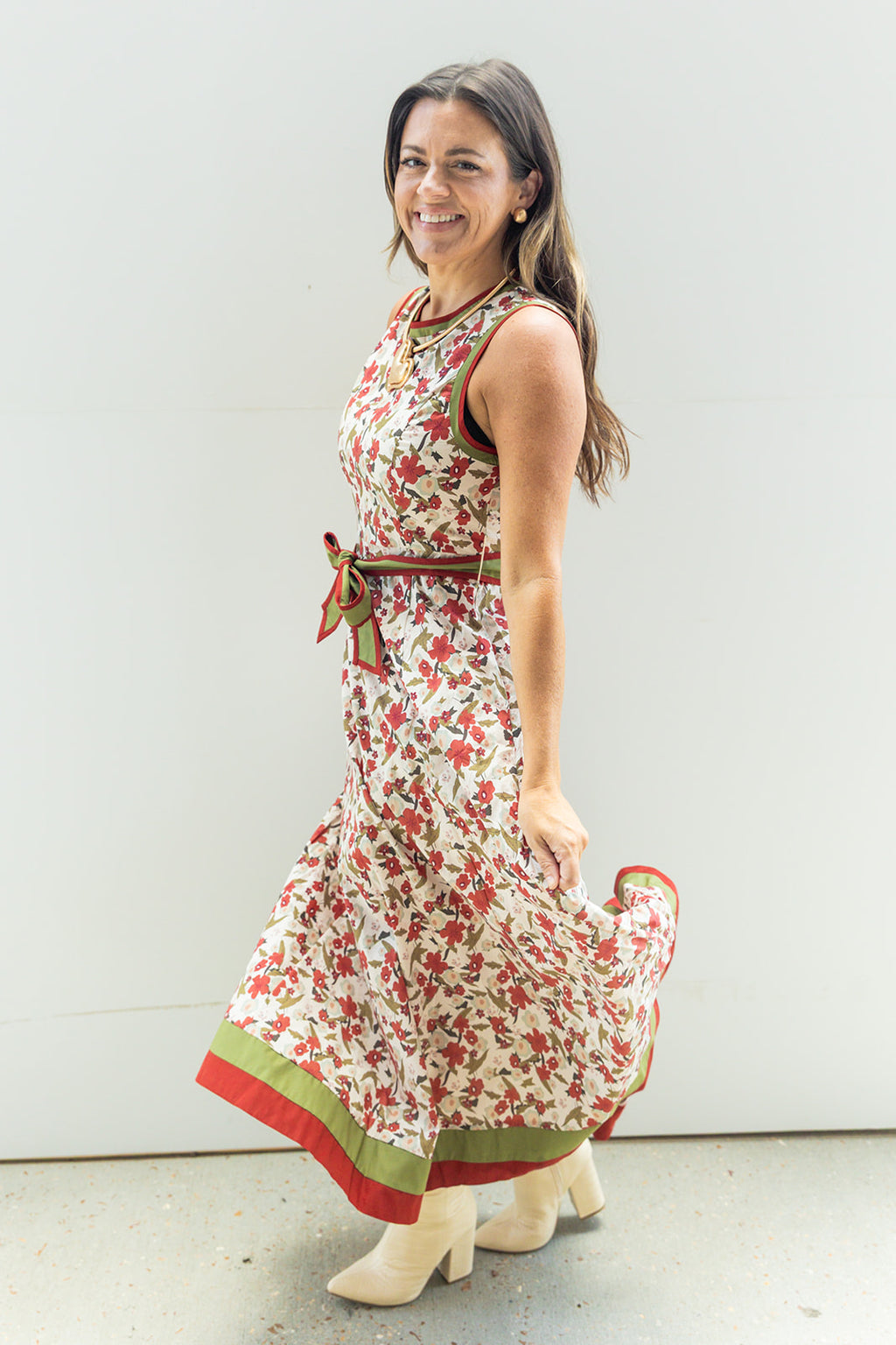 Floral print sleeveless midi dress featuring multicolor band finish midi dress. Zippper closure at back and removable belt.