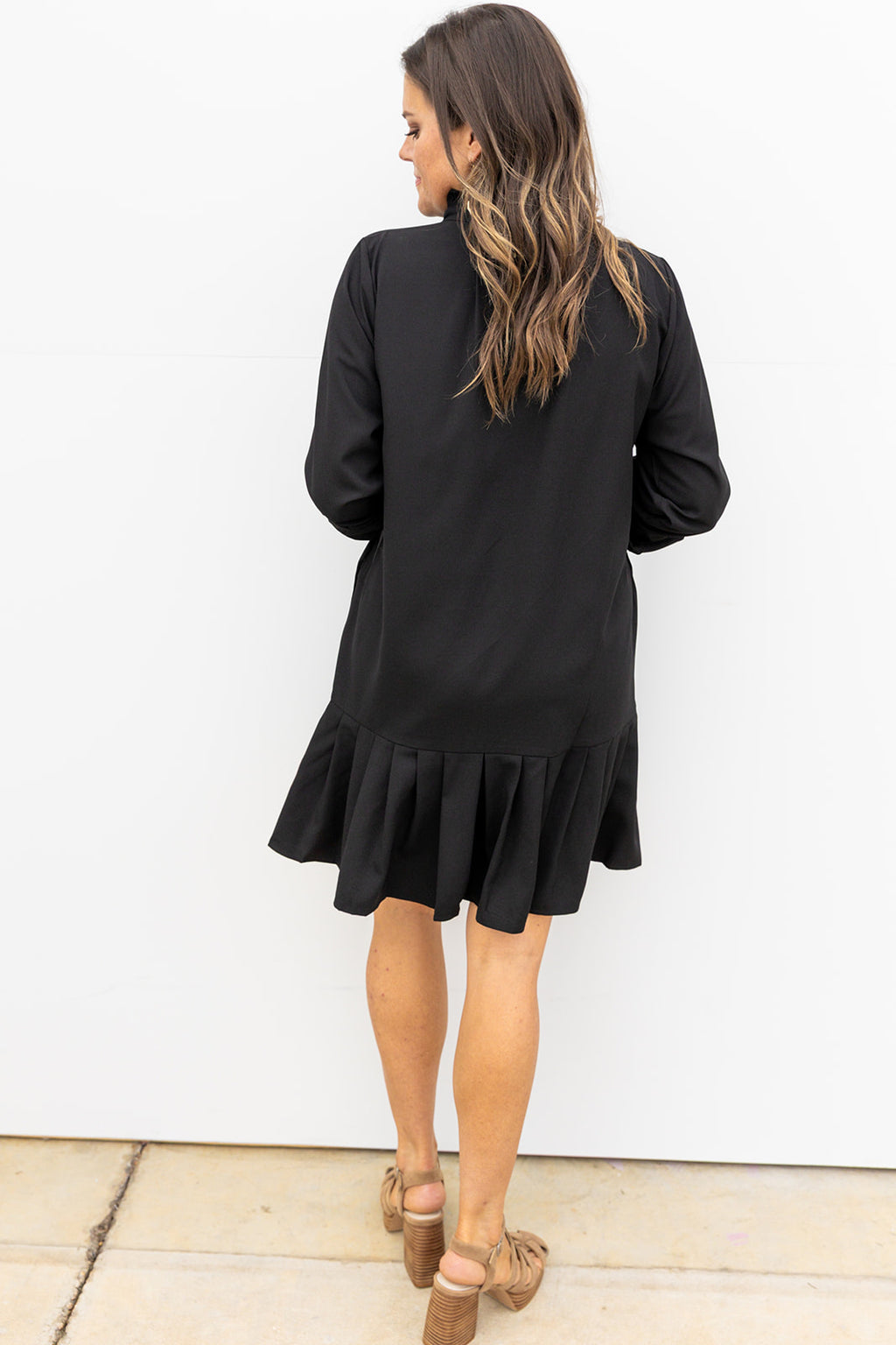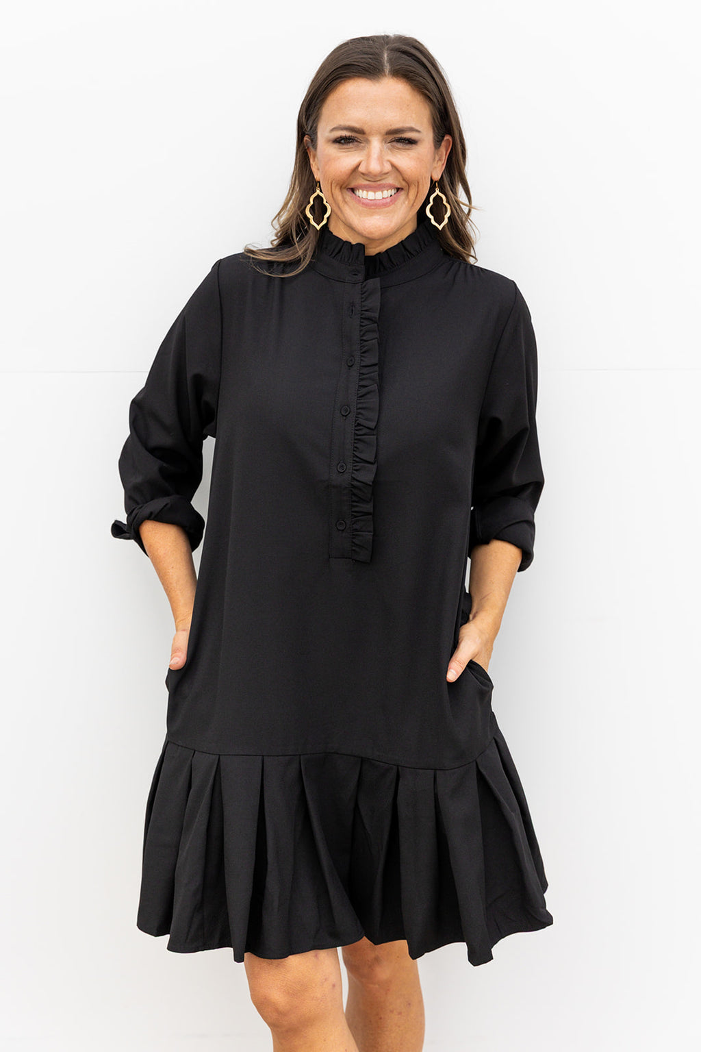 Step out in style with this playful Black shift dress, featuring a whimsical ruffle neckline that adds a flirtatious touch. The pleated hem brings movement and charm to every step, making it perfect for day or night. Embrace effortless elegance with a fun twist in this standout piece.