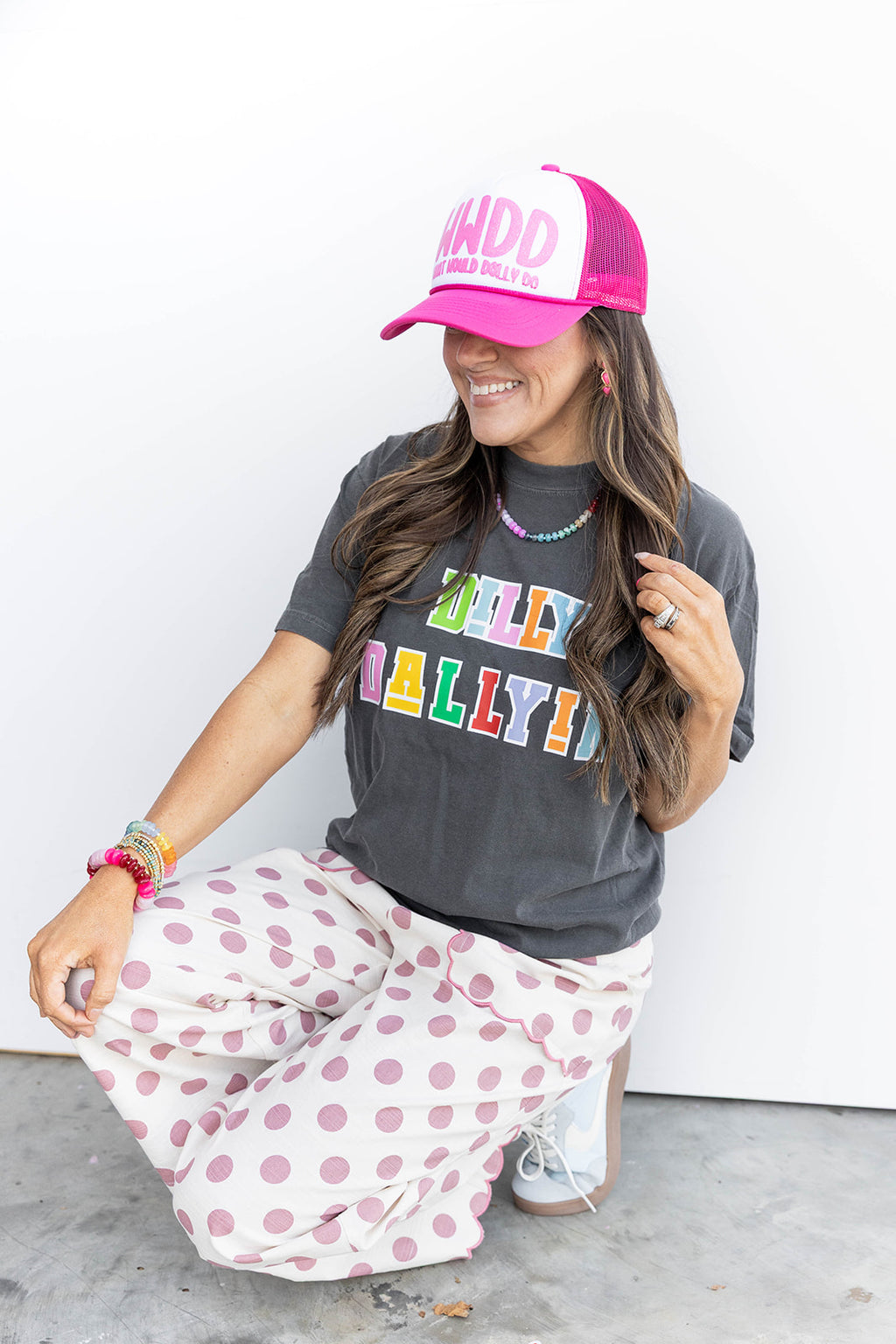 Playful, colorful, and effortlessly cool, the Dilly Dally Graphic Tee is the perfect everyday statement tee. Designed on a soft charcoal gray base, this tee features bold multi-color block lettering that adds a fun pop of personality to any outfit. The relaxed, easy fit makes it comfortable for all-day wear while still feeling cute and on-trend.
