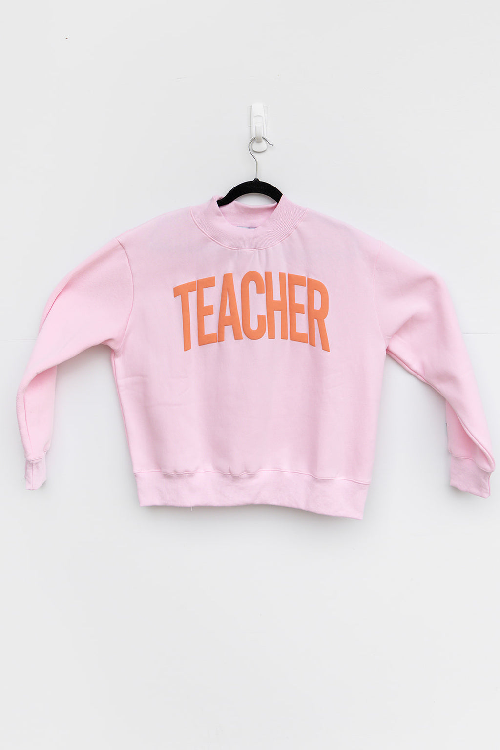 Designed on a dreamy soft pink mock neck, this sweatshirt features bold raised puff ink lettering in a standout peachy-orange hue that gives it that trendy, dimensional boutique look customers can’t resist. The mock neck silhouette adds a polished, elevated feel while still being comfy enough for all-day wear — from morning bell to after-school pickup.