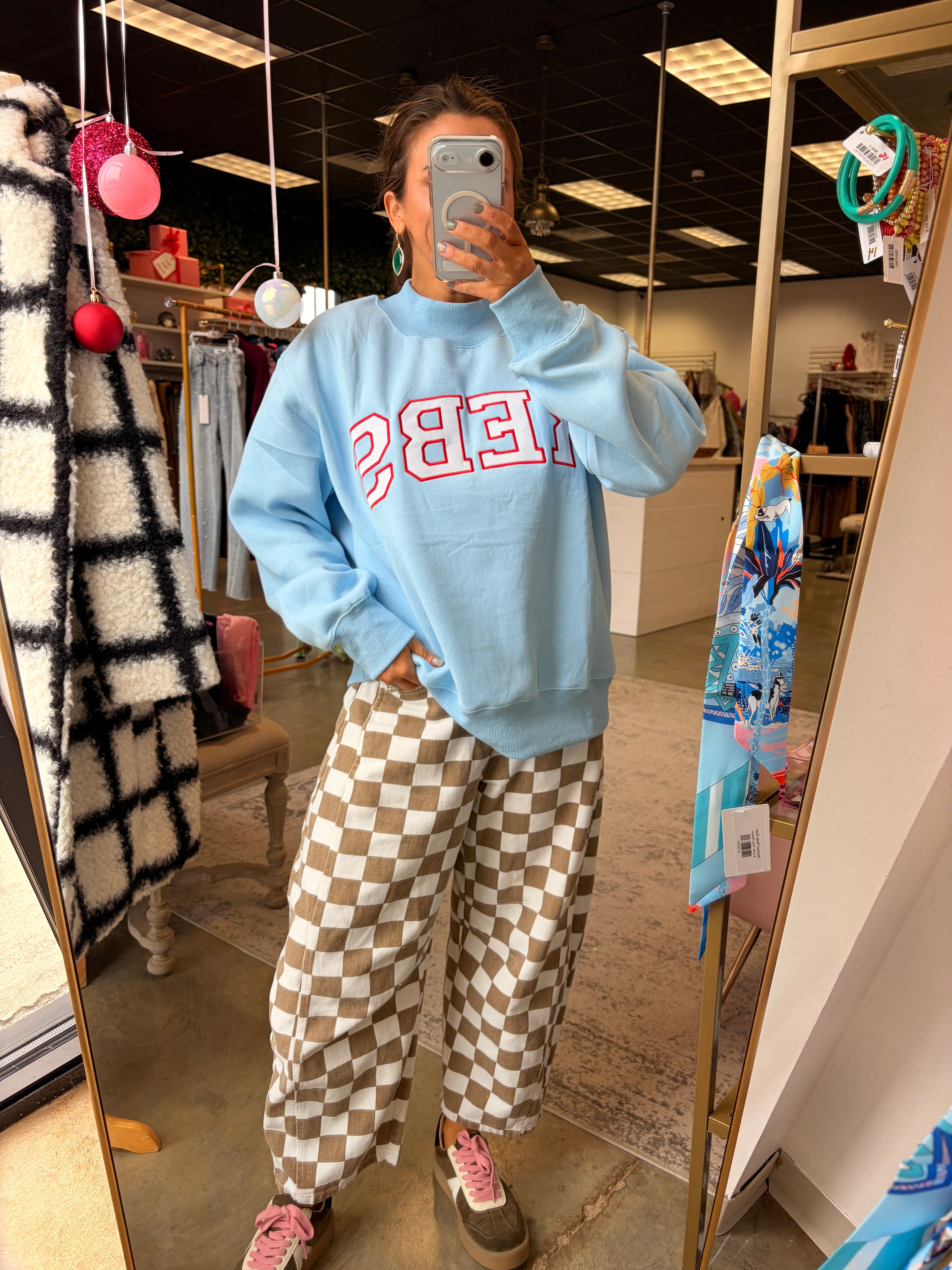 Applique word "REBS" on a powder blue