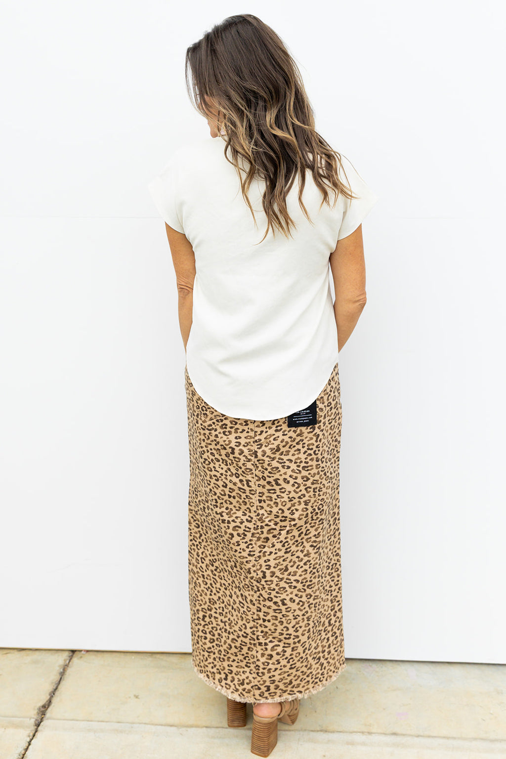 The Jungle Cruise Leopard Midi Skirt by Risen Denim is going to be a show stopper in your fall wardrobe.
