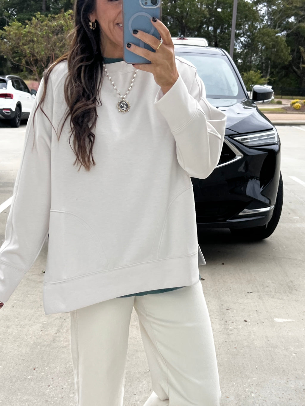 Rock this cozy crewneck pullover crafted from plush scuba fabric with cheeky side slits that add just the right amount of sass. Perfect for lazy days, casual hangouts, or whenever you're channeling your inner comfort queen.
