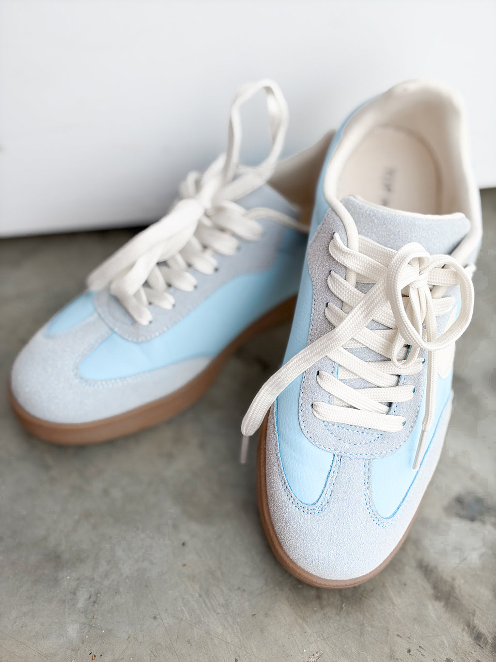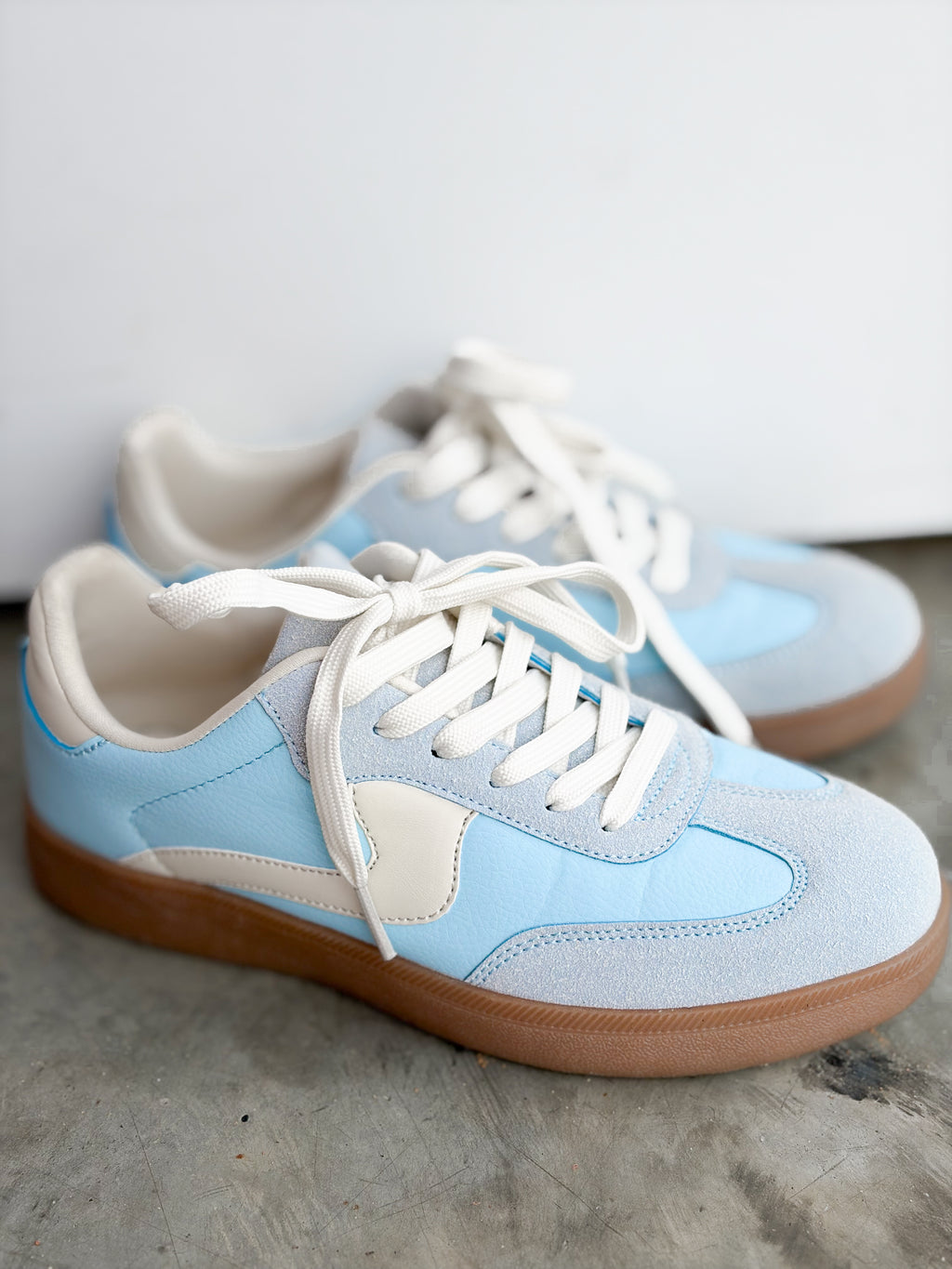 A soft blue, suede-trim sneaker with a comfy gum sole