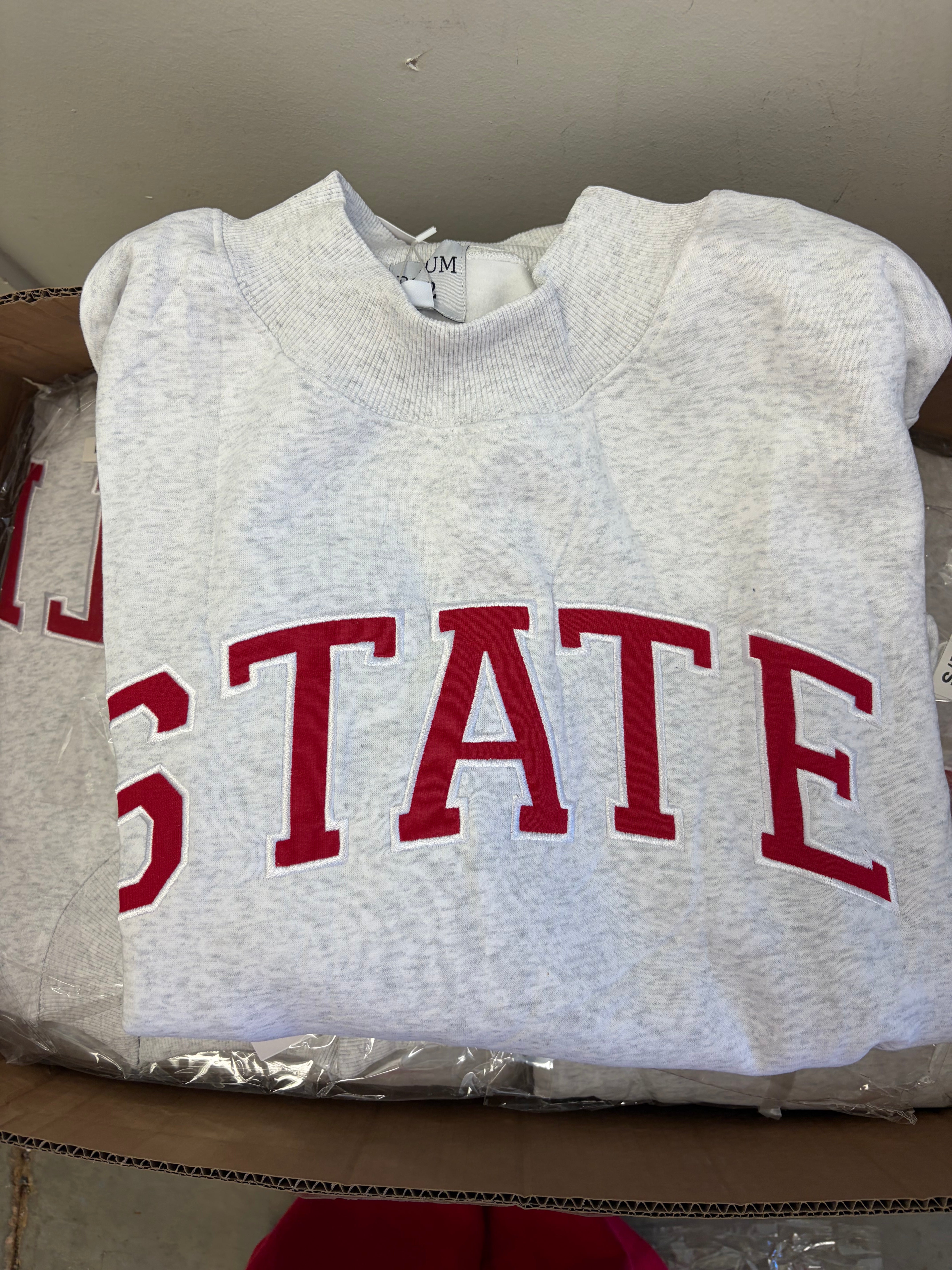 Applique word "STATE" on an ash color sweatshirt