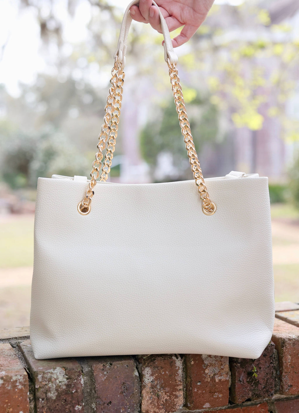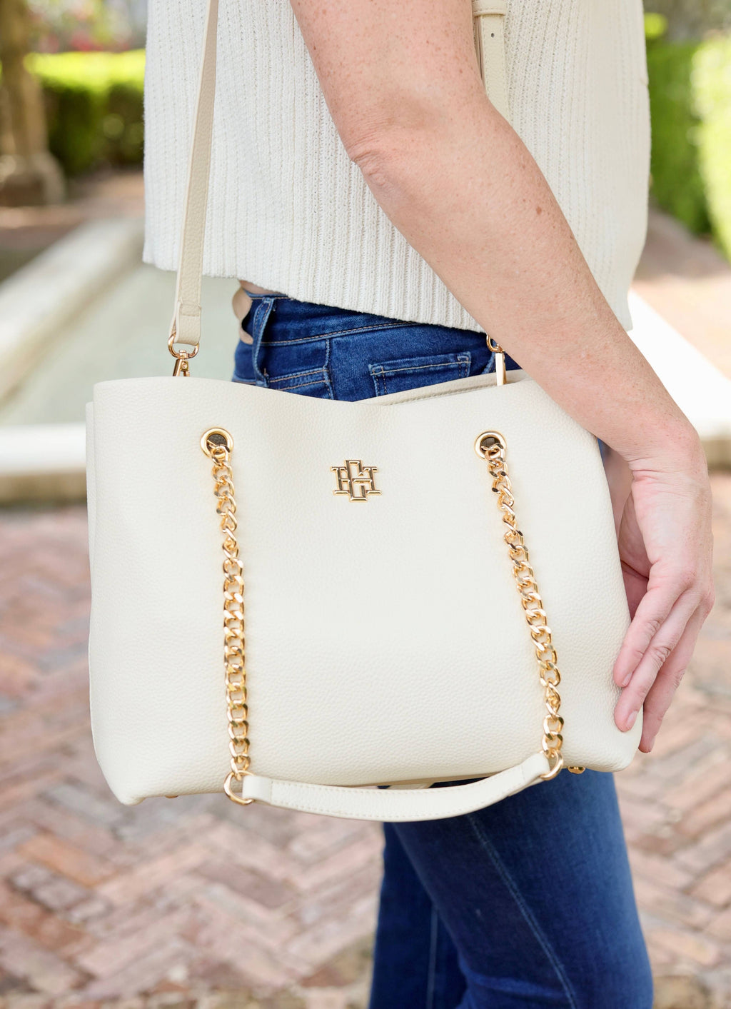This chic tote is made with a soft, pebbled vegan leather fabric. It features the Caroline Hill logo on one side and two chain handles with matching pebbled material. This tote has a top magnetic closure that leads to the organized interior. It features a center zippered section and two large open sections as well. You will also find one zippered pocket and one large open pocket inside. An adjustable crossbody strap is included that is easily removable.