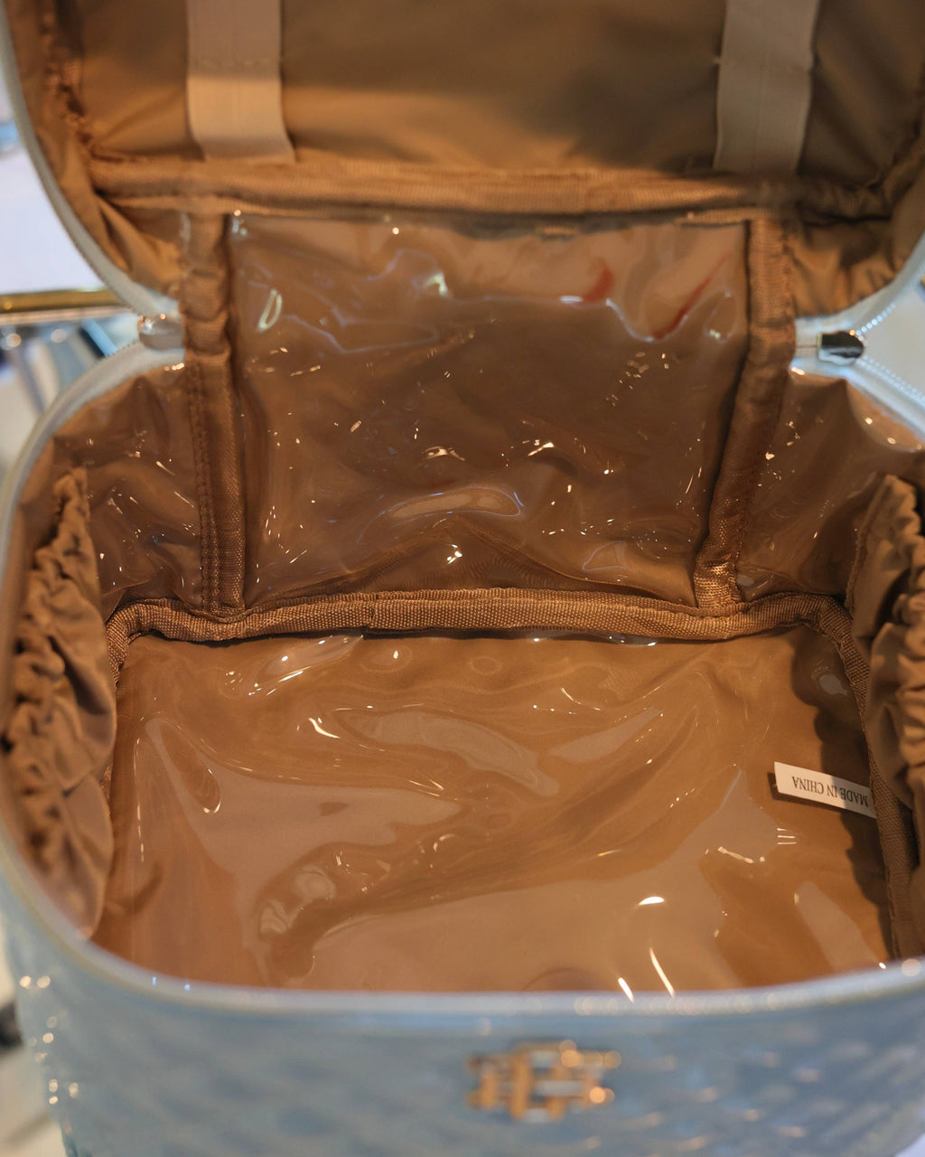 This stylish and functional vegan patent leather train case is part of our makeup and travel collection. It features a sleek quilted fabric design and a top carrying handle. The wide zipper closure provides easy access, making it perfect for organizing makeup, toiletries, and hair accessories. The spacious interior is lined with nude fabric with a clear protective fabric that is easily wipeable. The top of the train case has a zippered pouch and elastic holders for brushes, lipsticks, and more. The body of the case has two elastic pockets for added organization.