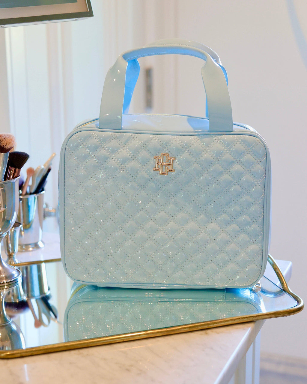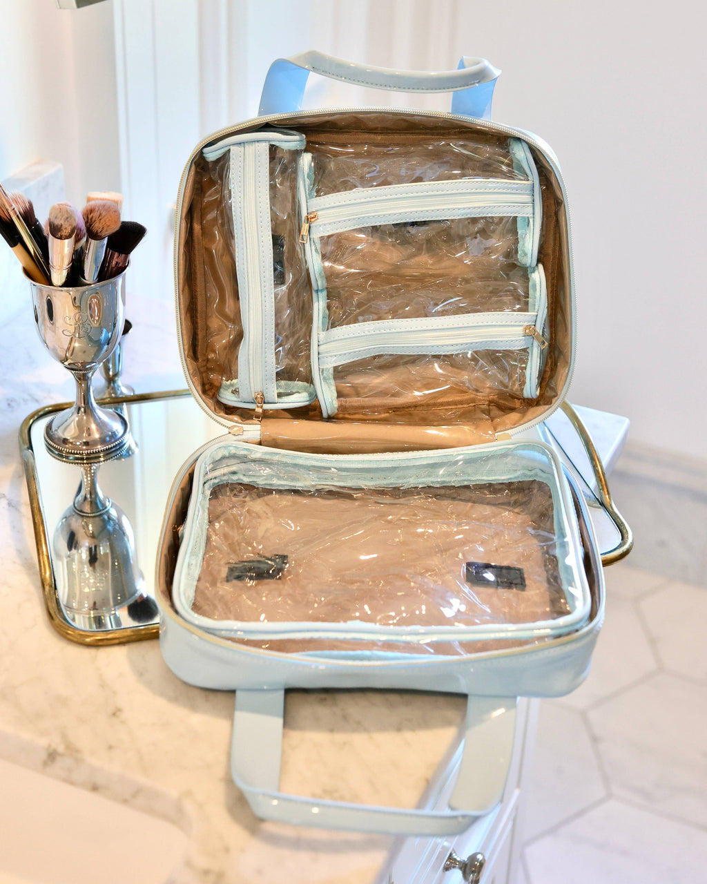 This large case is the ultimate makeup and travel piece. It features a quilted vegan patent leather fabric and two top carrying handles. The three sided zipper allows the case to unfold and lay completely flat, and the interior is lined with a nude fabric with a clear protective material. For ultimate organization, this case has four clear removable pouches that are attached to the interior with velcro. Each removable case has a zipper closure. The possibilities are endless when it comes to what this case can carry- cosmetics, toiletries, chargers, and more.