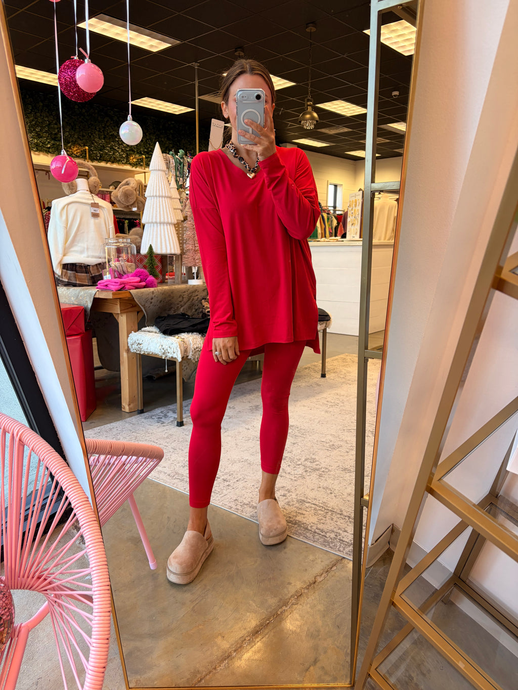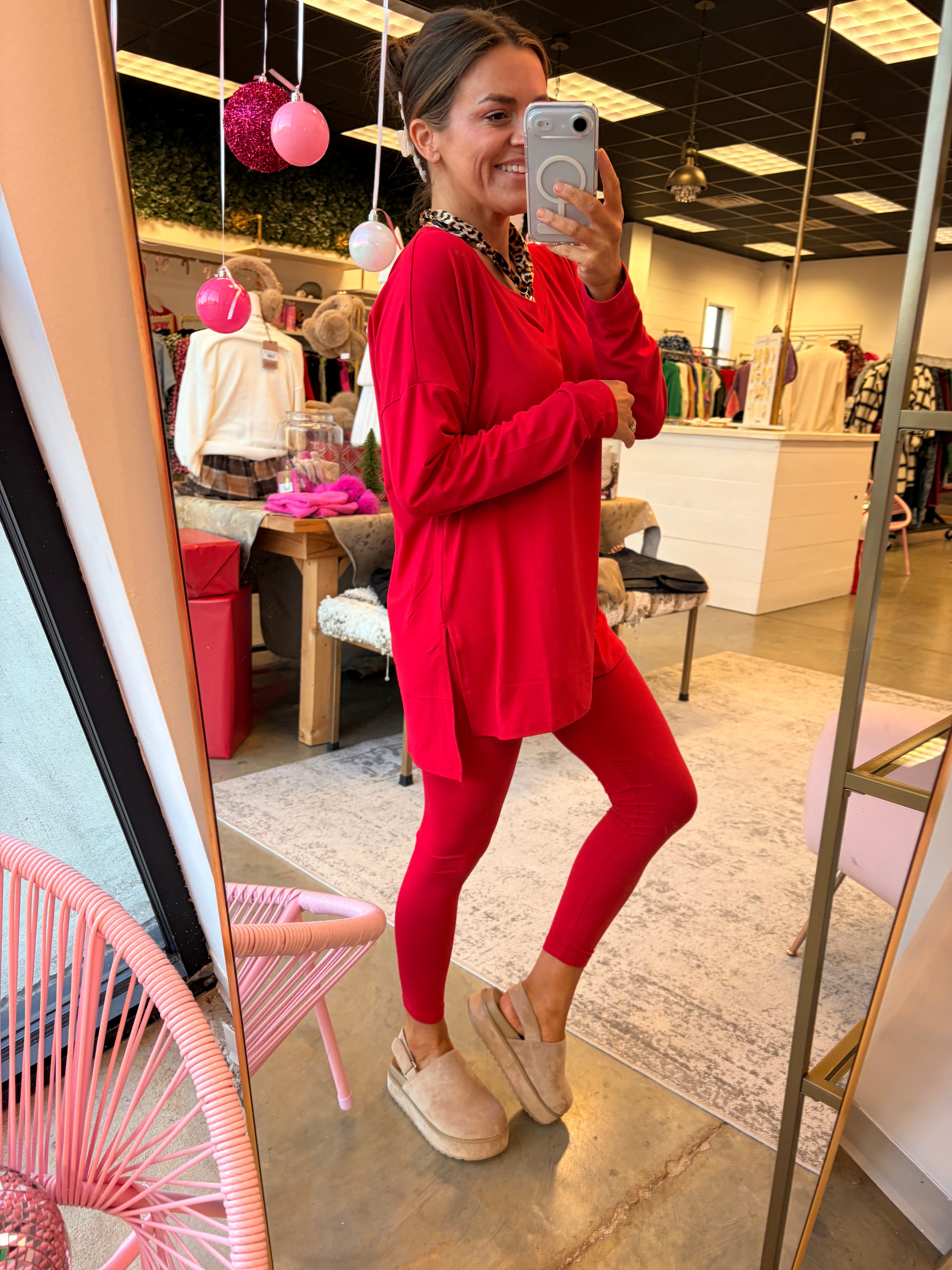Slip into cozy-chic comfort with our Bare Comfort Set in rich ruby red. This effortless two-piece features a soft long sleeve top paired with sleek leggings, perfect for lounging at home or running errands in style. The relaxed fit keeps you feeling free and fabulous all day long. Grab this doorbuster deal before it's gone!