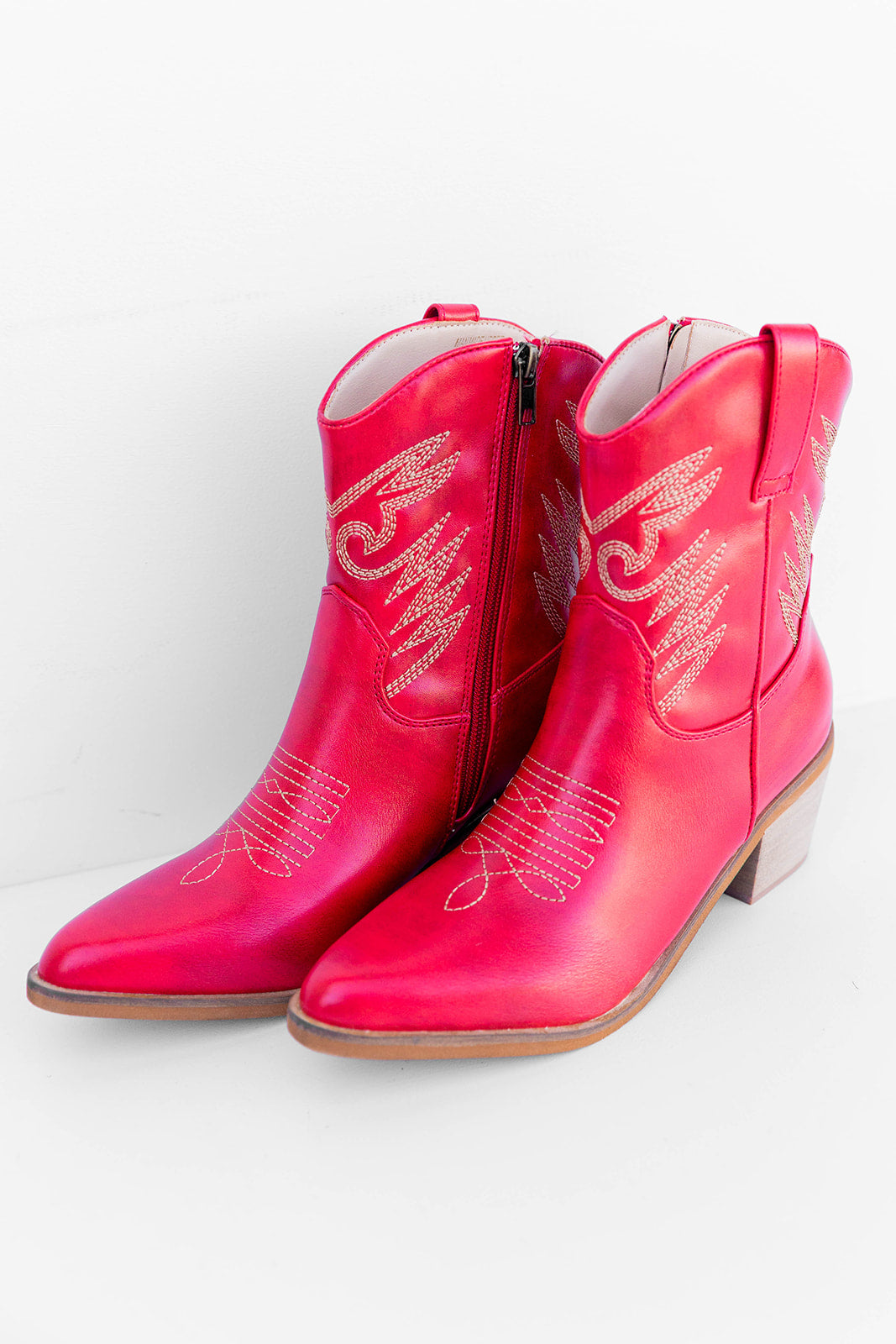 Step into Western charm with the Casey Watermelon high-top cowboy boots—a playful twist on a classic silhouette. These mini boots feature intricate stitching and rustic detailing that adds character to any casual look. The fitted design hugs your foot comfortably, while the convenient side zipper makes them easy to slip on and off. Perfect for channeling that effortless cowgirl vibe, whether you're heading to brunch or a night out. Pre-order yours today and saddle up in style.