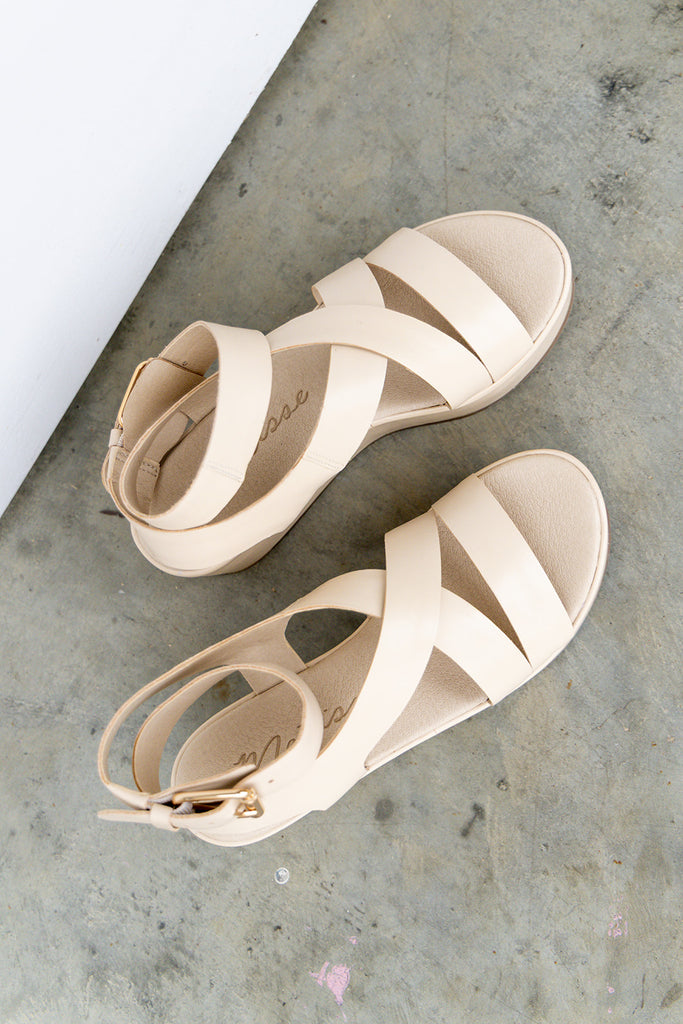 Vegan, two-band sandal with buckle detail on block heel.