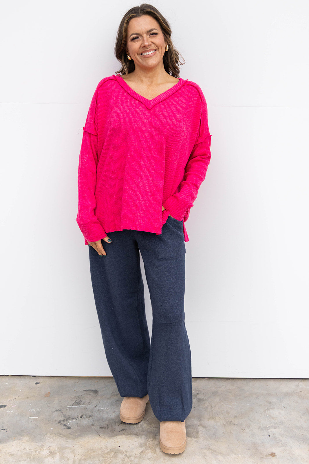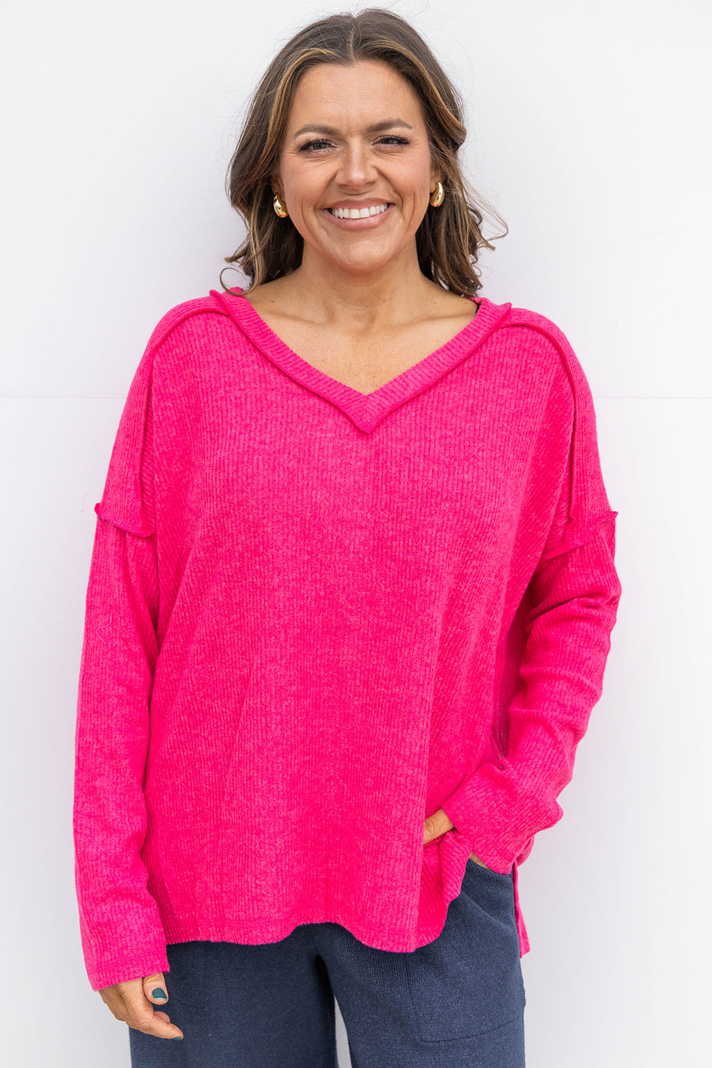 Turn heads in this vibrant brushed ribbed hacci sweater that's as bold as your personality. The luxuriously soft fabric drapes beautifully with relaxed drop shoulders, while the V-neck keeps things fresh and flattering. Hot pink is your secret weapon for adding instant energy to any outfit—layer it, style it solo, or make it the statement piece of your look. Comfort never looked this good.