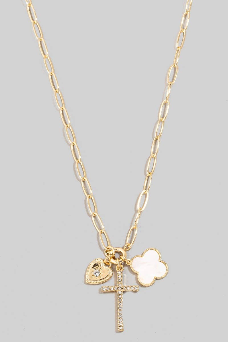 Pave Heart Cross And Shell Clover Charms Chain Necklace: GDCRM