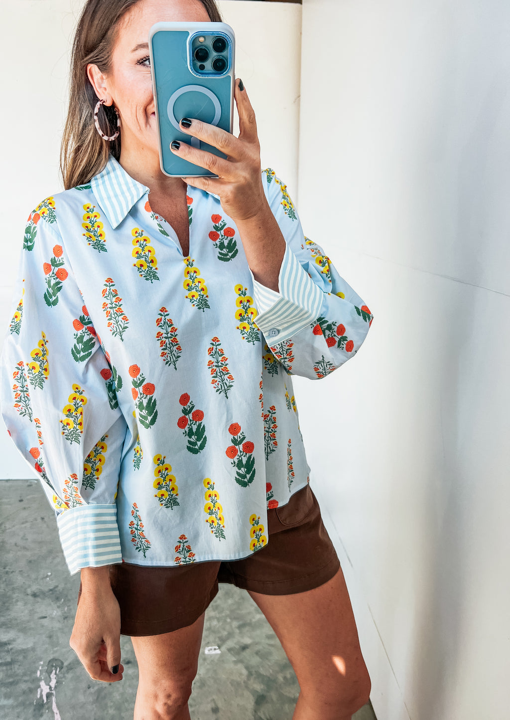• Pale blue blouse