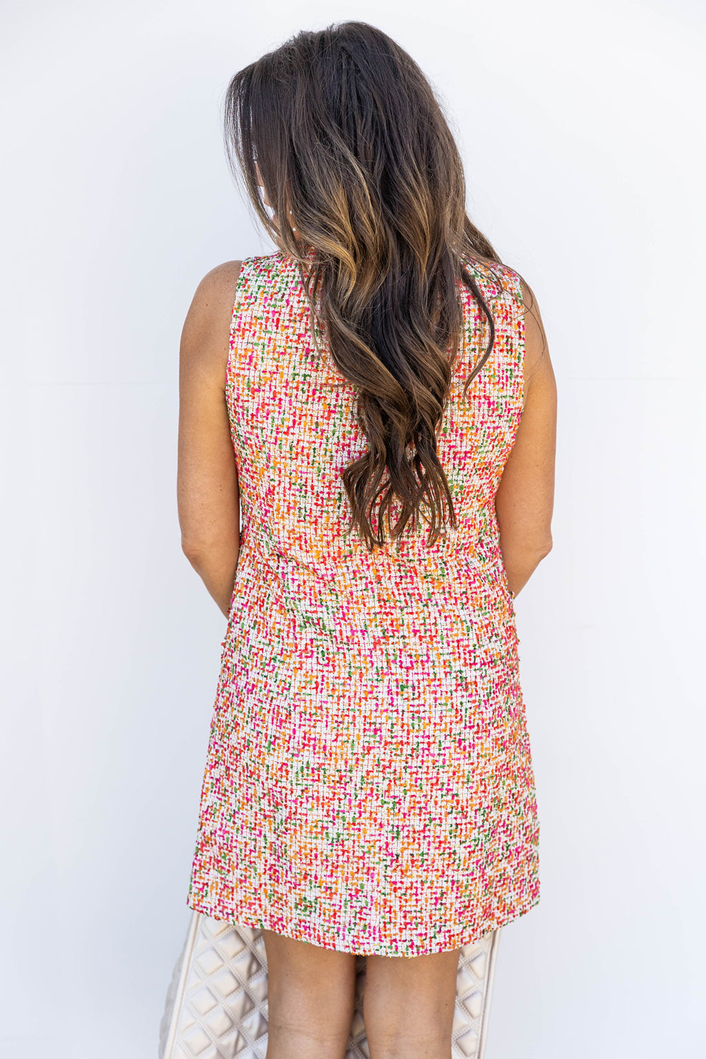 Elevate your look with the Park Avenue Dress, designed to turn heads with pearl embellishments around the neckline. Crafted from chic tweed, this dress blends classic texture with a playful twist. The functioning zipper ensures easy wear while adding a stylish edge. Perfect for days when you want to feel both polished and fun!