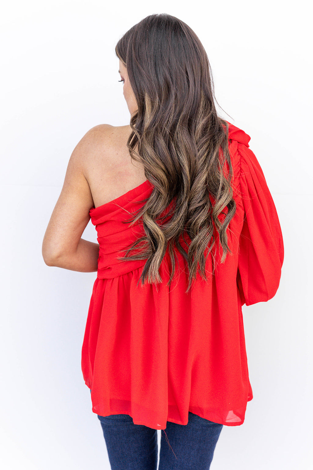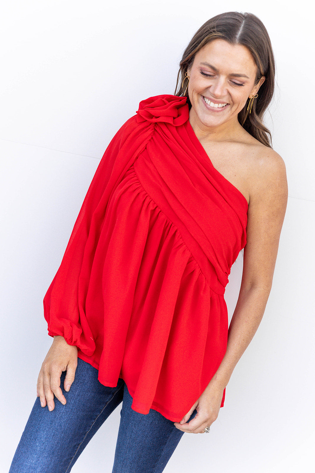 Slip into effortless elegance with the Rose & Pose Blouse in striking red. This one-shoulder design strikes the perfect balance between bold and romantic, while a delicate rose detail adds a touch of whimsy to one side. Perfect for date night, brunch, or whenever you want to feel a little extra fabulous. The asymmetrical cut flatters your silhouette and keeps things interesting—because why blend in when you can stand out?