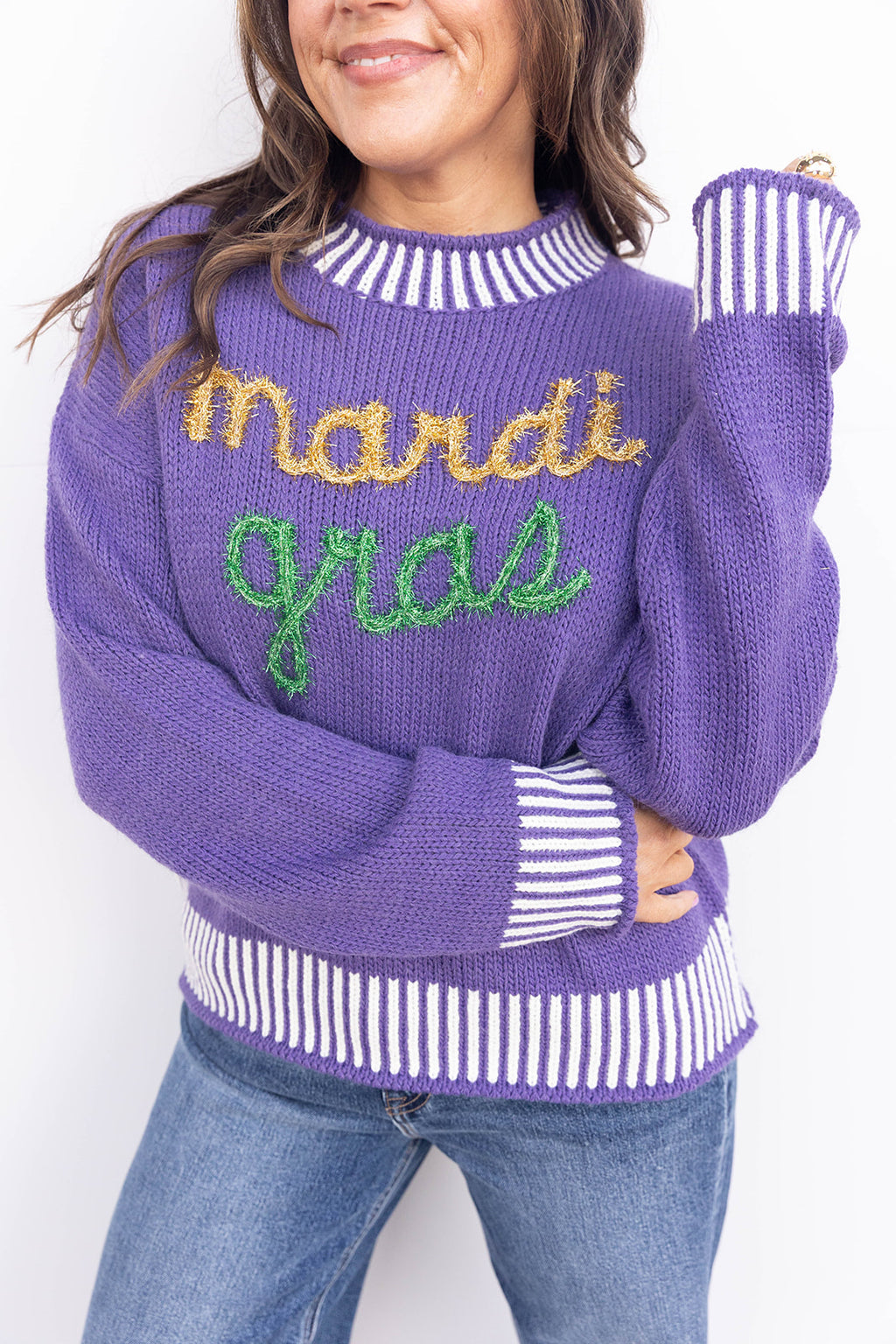 Celebrate Mardi Gras in style with this festive tinsel lettering sweater top! Shimmering metallic details spell out party vibes across the front, while contrast edge trim adds a polished finish. Perfect for holiday gatherings, themed events, or anyone ready to bring the bayou spirit to their wardrobe. The playful design captures that carefree Carnival energy in a wearable way. Dress it up or down for instant festive flair.